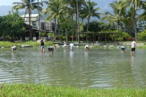 園區最受歡迎的活動莫過於「摸蜆兼洗褲」,在淺水池中尋找黃金蜆的樂趣。